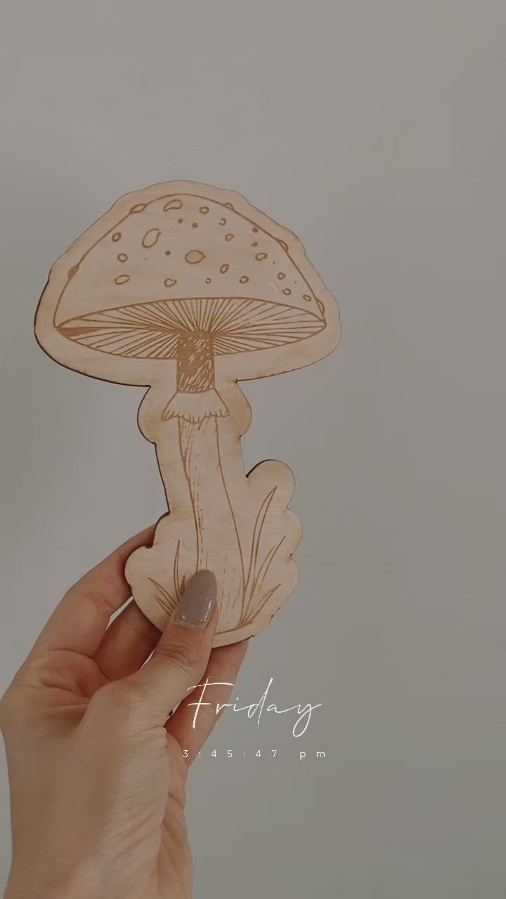 Decorate a shelf or a setup with this awesome wooden mushroom plaque.